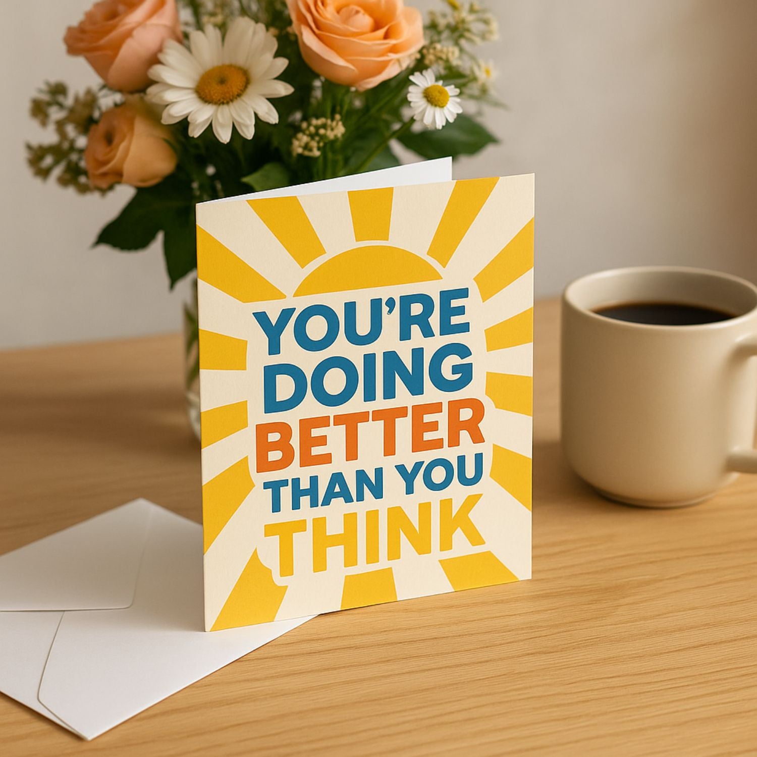 Some days are harder than others. This card is here for all of them. With the heartfelt reminder, “You’re Doing Better Than You Think,” this uplifting card is perfect for sending love, reassurance, and a nudge to keep going.